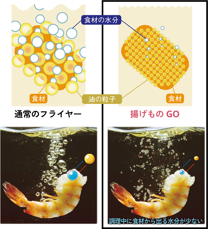 揚げものGOによって細分化された油が食材への密着を高めて、食材からの水分(旨み)流出を抑えます。